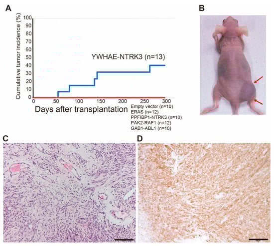 To understand the tumorigenic functions of BSTS-associated fusion genes and to test new therapeutic tools, it is important to establish animal models for introduction of fusion genes into appropriate cell types; however, it is often difficult to develop sarcomas in mice that are phenotypically representative of human diseases. Using retrovirus-mediated gene transfer and mouse eMCs, we have previously succeeded in creating ex vivo mouse models for human sarcomas [12,13,14,15]. Using this technology, we tried to generate mouse models expressing kinase-related genes identified in this study, including YWHAE-NTRK3, PPFIBP1-NTRK3, PAK2-RAF1, GAB1-ABL1 and wild-type ERAS. The full-length cDNAs of each gene were cloned into the pMY retrovirus vector and introduced into E18.5 eMCs of limb and trunk soft tissue prepared from Balb/c mice. Retrovirally transduced eMCs were immediately transplanted into the subcutaneous parts of Balb/c nude mice. Among five experimental lines, five of thirteen (38%) recipient mice bearing YWHAE-NTRK3-expressing eMCs developed subcutaneous tumors (Figure 5A,B). Morphological analysis of the mouse tumor with the YWHAE-NTRK3 fusion showed proliferation of short spindle tumor cells with fibromyxoid stroma (Figure 5C). The tumor was rich in blood vessels; however, eosinophilic hyaline changes were not observed, unlike in human sarcomas. The tumor showed strong positive staining for NTRK by immunohistochemistry using an anti-pan-TRK antibody (Figure 5D). The tumor exhibited invasive growth into the surrounding tissue and could be serially transplanted to nude mice, yet no distant metastasis was observed.
