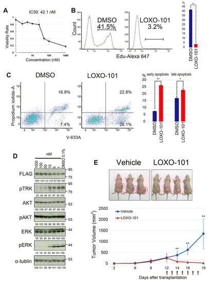 YWHAE-NTRK3-expressing murine sarcoma cells were treated with 50 nM of LOXO-101 (Selleck Chemicals, Houston, TX, USA) in vitro. Cells were seeded into 96-well plates at a concentration of 5 × 103 cells per well and were treated with drugs for 72 h. XTT assays were then performed, and the half-maximal concentration (IC50) was calculated. Fluorescence-activated cell sorting (FACS) analysis was performed for 24 h after treatment with drugs to detect Annexin-V- or EdU-positive fractions. For in vivo experiments, 1 × 106 cells were transplanted subcutaneously into Balb/c nude mice, and the mice were treated with 100 mg/kg of LOXO-101 via oral administration daily, for seven days.