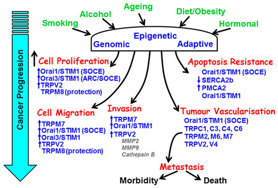 The remodelling of key components of the Ca2+ signalling machinery responsible for the hallmark processes of cancer during cancer progression. The major causes and risk factors of cancer induce genomic, epigenetic, and adaptive changes in key Ca2+ transporters responsible for the increase in cell proliferation, resistance to apoptosis, cellular migration and invasion, and tumour vascularisation.