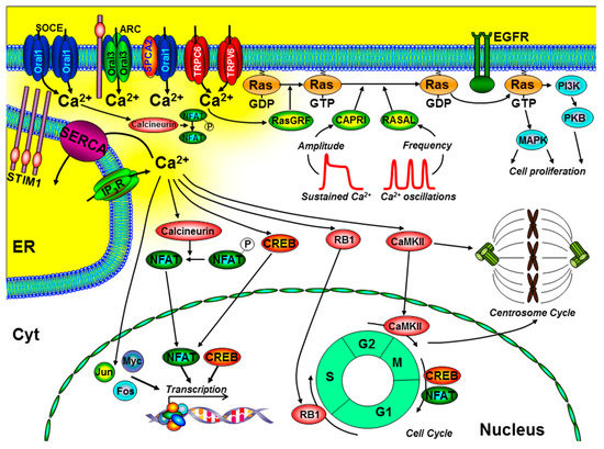 Ca2+ also has an important role at various stages of the cell cycle, especially early G1, G1/S transition, and progression through mitosis [31]. Ca2+-dependent phosphorylation of retinoblastoma-1 (RB1) is one of the key regulatory steps at the G1/S boundary and CaM kinase (CaMK) regulates progression through G1 and mitosis [24,25]. Moreover, the Ca2+-dependent phosphatase, calcineurin, is important during G1 and S phases, owing to the activation of the Ca2+-dependent transcription factors, CREB [23] and NFAT [22], which regulate the expression of key cyclin family of proteins (cyclin A, E, and D1) and cyclin-dependent kinases (CDK2, CDK4) [31]. Incidentally, specific Ca2+ entry through Orai1 [32], TRPC6 [33], and TRPV6 [34] has been shown to specifically and efficiently regulate NFAT-mediated gene expression. Furthermore, Ca2+ and CaMKII have been reported to directly regulate centrosome duplication and separation, which, when defective, can lead to aberrant mitotic spindles, aneuploidy, and genetic instability, all hallmarks of cancer [31] (Figure 2).