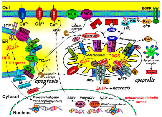In addition to mitochondrial Ca2+ content, cell death pathways are also influenced by ER Ca2+ content. ER Ca2+ concentration is critical for the correct synthesis, folding, and processing of newly synthesised proteins. Perturbation of ER Ca2+ can lead to either accumulated protein or incorrectly folded proteins, resulting in ER stress or the unfolded protein response (UPR) [70]. This leads to the activation of numerous ER chaperone proteins and transcriptional control of pro-survival genes (e.g., Bcl-2/Bcl-XL) and inhibition of the protein translation machinery, both of which are generally regarded as cytoprotective. However, prolonged and excessive ER stress or cytosolic Ca2+ overload can lead to the activation of m-calpain and the cleavage of pro-caspase-12, which normally resides on the ER membrane [71]. The cleavage product (caspase-12) can then activate downstream executioner caspases that engage a “point of no return” apoptosis cascade [71]. Ca2+ can also amplify cell death by activating cytosolic calpains [72], which can directly activate caspases [73] and inactivate the anti-apoptotic Bcl-2 [74], the Na+/Ca2+-exchange (NCX), and the PMCA [75,76,77,78,79] (Figure 3).