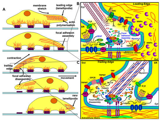 The role of key components of the Ca2+ signalling machinery in cell migration and invasion. The left panel (A) depicts the sequential steps of a migrating cell. The bottom part of the cell makes contact with the extracellular matrix (ECM) via integrins (purple rectangles), which couple the ECM to the actin cytoskeleton. The leading edge involves specialised membrane protrusions (lamellipodia/invadapodia) containing matrix metalloproteinases (MMPs), actin polymerisation, the assembly of focal adhesions, and the formation of new integrin-mediated contact sites. The trailing edge requires focal adhesion disassembly, actomyosin contraction, and the loss of rear-end contact sites. The right panels (B and C) show a magnified view of how key components of the Ca2+ signalling machinery regulate the leading edge (B) and the trailing edge of a migrating cell (C). At the leading edge, specific localised Ca2+ entry, amplified by Ca2+ release through IP3Rs, can lead to focal adhesion assembly via the Ca2+-dependent activation of calmodulin-dependent kinase (CaMKII), proline-rich tyrosine kinase (PYK2), and focal adhesion kinase (FAK). Ca2+ entry through store-operated Ca2+ channels (SOCE; consisting of ER STIM1 and Orai1), TRPM7, TRPV2, arachidonate-regulated Ca2+ channels (ARC; consisting of plasma membrane STIM1 and Orai1/Orai3 heteropentamers), and the non-SOCE (plasma membrane SPCA-regulated Orai1) have all been implicated in the regulation of cell migration and invasion. Membrane stretch can activate Ca2+ entry through TRPM7 and the α-kinase domain of TRPM7 can also phosphorylate myosin-IIA heavy chain and inhibit actomyosin contraction and lead to cell spreading. Ca2+ entry through TRPV2 has also been shown to regulate the release of MMPs and the focal degradation of the ECM. At the trailing edge, Ca2+ entry through SOCE and TRPM7 channels leads to the coordinated Ca2+-dependent activation of m-calpain, leading to focal adhesion disassembly, and myosin light chain kinase activation, leading to actomyosin contraction.