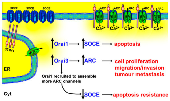 In addition to the widely studied Orai1 and STIM1, there are additional isoforms including Orai2, Orai3, and Stim2 that contribute to SOCE [217,218]. Recent evidence shows that Orai3 is up-regulated in breast [123,129,130,131], lung [133], and prostate cancer [132], and contributes to tumorigenesis [129,130]. Furthermore, it has recently been discovered that the store-independent, arachidonate-regulated Ca2+ entry channel (ARC) [219] consists of heteropentameric subunits of Orai1 and Orai3 [220] (Box 6).