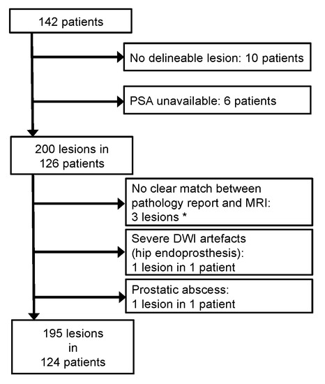 Patient flow chart. An initial database search retrieved 142 patients eligible for this retrospective study. However, 18 patients were excluded based on the exclusion criteria. In total, 124 patients with 195 lesions were included. (*) Three lesions could not be unambiguously matched between the pathology report and the MRI assessment. The affected patients, however, featured other lesions that were clearly matched.