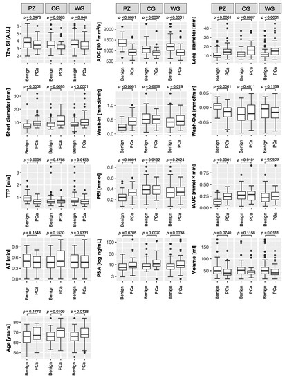 Boxplots of the acquired parameters. T2w signal intensity (SI), apparent diffusion coefficient (ADC), long and short diameter, dynamic contrast enhancement wash in and wash out, time to peak (TTP), peak enhancement intensity (PEI), initial area under the curve (iAUC), and arrival time (AT), and the additional parameters: prostate specific antigen (PSA) serum level, prostate volume, and patient age. Boxplots follow Tukey’s definition, with whiskers depicting the 1.5× interquartile ranges, and outliers marked as circles. The plots compare benign lesions (left boxes) with prostate cancer (PCa) lesions (right boxes), further divided into analyses of the whole gland (WG), and sub-analyses of the peripheral zone (PZ) and the central gland (CG). p-values, derived from Mann–Whitney U tests, are given above the plots.