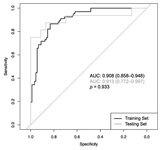 The CADx featured an area under the Receiver Operating Characteristic curve (AUCROC) of 0.908 (CI: 0.858–0.948) during training and 0.913 (CI: 0.772–0.997) during testing, with no significant difference (p = 0.933; Figure 3). No other accuracy parameters, including sensitivity, specificity, PPV and NPV, overall accuracy, and positive/negative likelihood ratio differed significantly (Table 3).