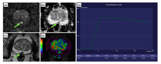 Clinical case from the testing set. This 74-year-old patient was referred to radiology for prostate MRI because of an increase in serum PSA levels to 8 ng/mL and the suspicion of prostate cancer. Multiparametric MRI revealed a 10 × 7 mm PI-RADS 4 lesion dorsally in the mid/apical peripheral zone (green arrow; classification according to PI-RADS v2.1 [6]). The lesion featured high signal intensity in DWI (a), along with a strong diffusion restriction in ADC (b). T2w axial images showed a signal decrease in the sharply delineated lesion (c). The lesion featured a steep wash-in curve, along with a decent wash out (d,e). Subsequent histopathology revealed scarred prostate tissue and few prostate glands with urothelial metaplasia, but no evidence of malignancy. The CADx correctly excluded malignancy for this peripheral zone PI-RADS 4 lesion, with a false negative rate of 3%. The patient received a follow-up examination 9 months later in which the lesion had remained unchanged.