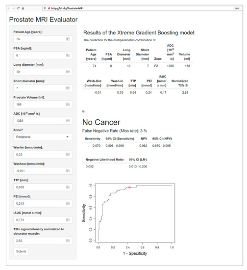 This study presents a classification CADx to discriminate between malignant and benign lesions in prostate mpMRI using an open-access web application. The CADx features an ROCAUC of 0.908, which is within the upper range of previously published CADx systems [11,12] that ranged from 71% [13] to 97% [14] for 1.5 T scanners, and from 77% [15] to 95% [16] for 3 T scanners. Nevertheless, comparing diagnostic accuracies of CADx systems directly is almost impossible, since different studies were performed with different magnetic field strengths, were based on mono-, bi-, or multiparametric image material, defined different variables as a target to be optimized (e.g., overall accuracy, sensitivity, specificity, and ROCAUC), or were based on relatively low patient numbers. The threshold value for the diagnosis of malignancy of the algorithm presented here was calculated from multiparametric images from 1.5 and 3 T scanners in such a way that the ROCAUC was maximized.