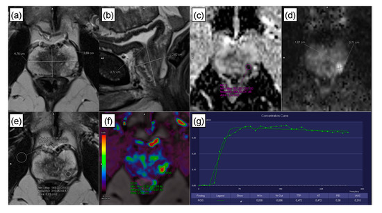 Figure 6. Image assessment. (a,b) Prostate volume was calculated from the diameters measured in axial and sagittal T2w images, as described in the PI-RADS v2.1 guidelines [6]. A circular region of interest (ROI) was placed within a lesion, for lesions of the peripheral zone, preferably on the ADC map (c) in additional consideration of DWI (calculated b-value of 1500 s/mm2; (d)), and for lesions of the transitional zone/central gland, preferably in the axial T2w sequence (e) [5,6]. Following placement, the ROI was copied to the other sequences using the software. If lesion measurement was difficult or compromised on ADC (for peripheral zone lesions) or T2w (for transitional zone/central gland lesions), measurements were performed on the sequence that showed the lesion best [5,6], e.g., in the above example, lesion dimensions were assessed on DWI (d). (f,g) Time-intensity curves were automatically calculated by the software, yielding the dynamic parameters: wash in, wash out, time to peak (TTP), peak enhancement intensity (PEI), arrival time (AT), and initial area under the curve (iAUC). - ADC (10–6 mm2/s; Figure 6c,d), because PCa aggressiveness and ADC correlate inversely [30].