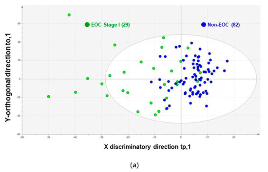 Glycopeptide spectra data (Figure S1) were analyzed in a multivariate manner [9,10,11], and OPLS-DA was applied to distinguish between the EOC and non-EOC control groups (Table S1). Before OPLS-DA, the data set was separated into training and test sets (Table S1) to validate the training model. OPLS-DA showed two-dimensional differentiation using the first and second principal components (Figure 1 and Figure S2). OPLS-DA is a method that elicits discriminating factors between two classes, and the model is generated by reducing non-discriminable dimensions (spaces) step-by-step, thereby eliciting an underlying factor (single dimension determined in 1712-dimension space) that discriminates between two groups. We defined values of the first component as CSGSA value (CSGSA (OPLS-DA)); the values of the EOC and non-EOC control groups obtained via OPLS-DA were plotted as box-whisker plots for the training and test sets, respectively.