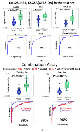 Test set: biomarker performance for the detection of stage I epithelial ovarian cancer (EOC) versus non-EOC control. (a) Orthogonal partial least-squares discriminant modeling (OPLS-DA) scatter plot for stage I EOC (green dots) and non-EOC control (blue dots) samples. When the test sample data set was evaluated using the trained model (Figure S2), a better differentiation was achieved in the test set between EOC (n = 29) and non-EOC patients (n = 82). Definition of comprehensive serum glycopeptide spectra analysis (CSGSA (OPLS-DA)): data structure was constructed using 1712 glycopeptide levels obtained from 225 examinees (training set: 1712 × 225 matrix), which was geometrically assumed as 225 scattered plots in the 1712-dimension space. OPLS-DA aims to find two new axes in the 1712-dimension space, which maximizes separation between the EOC and non-EOC control groups. CSGSA values (CSGSA (OPLS-DA)) were obtained via the first OPLS-DA score component, showing maximum separation of the two groups. (b) Box-whisker plot and receiver operating characteristic (ROC) curve of cancer antigen 125 (CA125), human epididymis protein 4 (HE4), and CSGSA (OPLS-DA) of serum samples in the test set. (c) ROC curve of the combination assay of cancer antigen (CA) 125, human epididymis (HE) protein 4, and CSGSA (OPLS-DA). The combination index for CA125, HE4, and CSGSA (OPLS-DA) was calculated using the following equation: combination index = (0.43 × CA125) + (0.11 × HE4) + (0.46 × CSGSA [OPLS-DA]). This combination index shows a much higher area under the curve (96%) than CA125, HE4, or CSGSA (OPLS-DA) when used alone. The cutoff of this combination index was used to maximize the sensitivity and specificity for separating stage I EOC from non-EOC controls, as defined using 0.120 obtained via ROC curve analysis in the training set. The combination index is calculated as follows: the values of CA125 and HE4 are logarithmically transformed. The transformed CA125, HE4, and CSGSA values are normalized such that the mean value is zero and the standard deviation is one. The three transformed values are then summed with weighted parameters, which are optimized using Excel powered by Solver, a sequential quadratic programming method that maximizes two-group separation under a constrained condition. The sum of the three weight parameters is one.