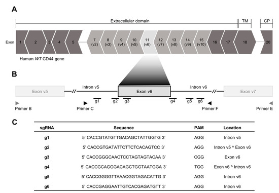 Human CD44 locus and CRISPR/Cas9 single guide RNA (sgRNA) design strategy. (A) The human CD44 canonical transcripts annotated with 18 exons (ENST00000428726.8). The dark grey exons comprise the constitutively expressed portion of the gene (exons 1–5, 16–18 and 20), and the light grey corresponds to the alternatively expressed portion of the gene in humans (exons v2–v10). Each exon is docked to adjacent exons in the mRNA sequence. Every set of three nucleotides encodes the amino acids that will comprise the CD44 protein. In the exon boundaries, the resultant amino acid may enclose the last nucleotide of the former exon and the two first nucleotides from the next exon (>), or contain the two last nucleotides of the former exon and the first nucleotide from the next exon (<). This indicates that if exon-v6 is removed, exons v5 and v7 are spliced in-frame. (B) Genomic spots of the sgRNA designed to target the adjacent areas to exon-v6. Primers B and E (represented in grey) were used to genotype the complementary DNA (cDNA) and primer C and F (represented in black) were used to genotype the genomic DNA (gDNA) of the edited cells. (C) Specifications of the sgRNAs (g1–g6) designed near the exon-v6 vicinity to permanently induce exon-v6 skipping. TM—Transmembrane domain; CP—Cytoplasmic domain; WT—wild-type; PAM—Protospacer Adjacent Motif.