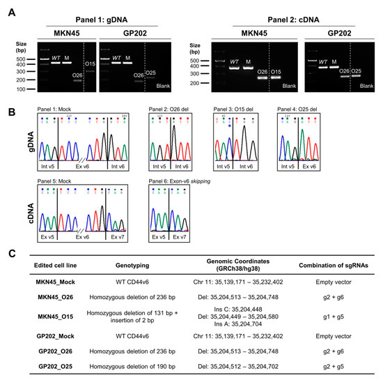 Genotyping analysis of CRISPR/Cas9 edited GC cells. (A) Analysis of gDNA (Panel 1) and cDNA (Panel 2) from wild-type (WT), Mock and edited GC cell lines. In Panel 1, MKN45/GP202_Mock cells present a transcript of the same size of WT (422 bp), while the edited cell lines present a transcript with smaller sizes (MKN45_O26 and GP202_O26–186 bp; MKN45_O15–293 bp; GP202_O25–232 bp). In Panel 2, MKN45/GP202_WT and Mock cells present a transcript with a size of 378 bp, while all edited cell lines present a smaller transcript (249 bp) corresponding to the occurrence of exon-v6 skipping. All PCR products were run in the same 2% agarose gel (Figure S1). (B) Representative examples of sequencing analysis: Panel 1—gDNA of Mock cells; Panel 2—gDNA deletion of 235 bp of O26 clones. (The present sequencing analysis was performed with gDNA extracted from MKN45_O26, but GP202_O26 presents the same deletion); Panel 3—gDNA deletion of 131 bp of O15 clone (* C nucleotide is a single nucleotide insertion); Panel 4—gDNA deletion of 190 bp of O25 clone; Panel 5—cDNA of Mock cells; Panel 6—cDNA of all edited clones, which represents the skipping of exon-v6. (C) Specifications of each edited cell line by CRISPR/Cas9 with the respective edition genomic coordinates (GRCh38/hg38) and the combination of sgRNAs transfected to create each edited cell line. WT–wild-type; M–Mock; gDNA–genomic DNA; cDNA–complementary DNA; Chr—Chromosome; Del—Deletion; Ins—Insertion.