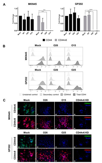 We established a CRISPR/Cas9 strategy to target the adjacent areas of exon-v6 (Figure 1A), by designing single guide RNAs (sgRNAs) (g1–g6) in the exon-v6 vicinity (Figure 1B,C), to achieve exon-v6 skipping. After genome editing, we obtained two edited cell lines for MKN45 (O26 and O15) and GP202 (O26 and O25). To evaluate whether our strategy successfully removed exon-v6 from CD44v isoforms, genomic DNA (gDNA) was amplified, using primers for exon-v6 flanking introns (Primers C/F, Table 1). Resulting products were smaller in edited cells than in wild-type (WT) and mock controls (Figure 2A, left panel). This was confirmed by Sanger sequencing (Figure 2B, panel 1–4), showing that all CRISPR/Cas9 edited cell lines presented homozygous deletions encompassing exon-v6 (Figure 2C). To evaluate specific exon-v6 skipping, complementary DNA (cDNA) was amplified with primers in v5 and v7 adjacent exons (Primers B/E, Table 1). All edited cell lines presented a smaller transcript, corresponding to splicing between exons v5-v7 and in-frame exon-v6 skipping (Figure 2A, right panel; Figure 2B, panels 5–6). By real-time quantitative PCR (RT-qPCR), we verified that our editing strategy was specific for CD44v6-containing isoforms, as no exon-v6 expression was detected in edited cells, while total CD44 expression was maintained (Figure 3A). By flow cytometry, we showed that edited cell lines presented depletion of the exon-v6 encoded peptide, while maintaining equivalent total CD44 protein levels as mock cells (Figure 3B). To demonstrate that only the v6-encoded domain was skipped, we performed co-immunofluorescence for CD44v6 and CD44v9, a variant exon downstream of exon-v6 that is often included in CD44v6-containing isoforms. As expected, exon-v6 and exon-v9 were co-detected in mock cells, while in edited cells, only exon-v9 was detected (Figure 3C). When using v6-directed siRNAs (CD44v6 KD cells), both exon-v6 and exon-v9 expression disappeared, demonstrating that exon-v6 and exon-v9 are both present in the same CD44v6-containing isoforms detected with this approach. These data support that, exon-v6 skipping in edited cells occurs without interfering with downstream exon-v9, demonstrating that CD44v isoforms expression remains unchanged.
