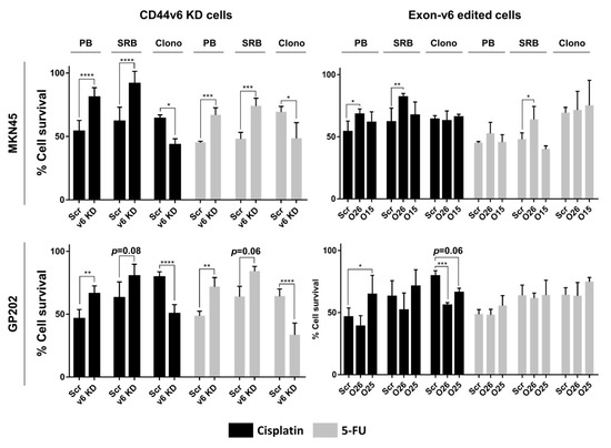 We previously demonstrated that MKN45 and GP202 GC cell lines, which express CD44v6-containing isoforms, are less sensitive to cisplatin than CD44v6-depleted counterparts [18]. To evaluate if exon-v6 is, itself, responsible for modulation of chemotherapy response in these cell lines, we performed short and long-term assays in the presence of cisplatin and 5-fluorouracil (5-FU). For that, we compared mock cells treated with scramble siRNA (scramble), with CD44v6 knockdown (KD) cells, or with exon-v6 edited cells. In both cell lines, 48 h after treatment, we observed that CD44v6 KD cells survived better than scramble in presto blue (PB) and sulforhodamine B (SRB) assays (Figure 4, left panel). The outcome of short-term treatment in MKN45 and GP202 exon-v6 edited cells mimicked the observations for CD44v6 KD for at least one clone per cell line, but only for cisplatin treatments, and mainly for the PB assay. For SRB assay, only MKN45_O26, treated either with cisplatin or 5-FU, mimics the significant cell survival increase observed in CD44v6 KD. Regarding the long-term survival, clonogenic assay demonstrated the opposite, as CD44v6 KD cell survival significantly decreased when compared to scramble, in response to both drugs (Figure 4, left panel). The same was true for both GP202 edited cells, which presented a statistically significant or strong tendency for decreased cell survival to cisplatin compared to control (Figure 4, bottom right panel). Overall, these results demonstrate that exon-v6 skipping mimics to some extent the effect that CD44v6 KD have in GC cell survival. Moreover, it consolidates the role of both CD44v6-containing isoforms, and exon-v6 alone, as positive modulators of GC survival.
