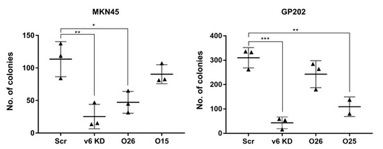 Self-renewal capacity of MKN45 and GP202 cells in response to the KD of CD44v6 isoforms or specific exon-v6 skipping. Colony formation capacity of Scramble, CD44v6 KD cells and exon-v6 edited cells lines. Results show the mean ± SD of three independent experiments. Statistically significant results were determined by two-way ANOVA with Tukey’s Post Hoc Test for multiple comparison analysis (* p < 0.05; ** p < 0.01; *** p < 0.001). Src–Scramble; v6 KD–CD44v6 Knockdown; KD—Knockdown.