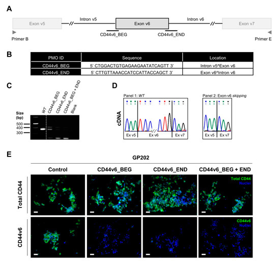 Characterization of transfected cells established from WT GP202 GC cell line, using a PMOs approach. (A) Scheme of the PMOs designed to target the splice-sites of exon-v6. Primers B and E (represented in grey) were used to genotype the cDNA of cells. (B) Specifications of PMOs (CD44v6_BEG and CD44v6_END) designed to target the splice-sites of exon-v6 and cause exon-v6 skipping. (C) Analysis of cDNA from WT and transfected cells with either single or mixed PMOs. Transfected cells present a smaller transcript (249 bp) than WT cells (378 bp), corresponding to the skipping of exon-v6. All PCR products were analyzed in the same 2% agarose gel (Figure S3). (D) Representative examples of the sequencing analysis: Panel 1—WT 378 bp transcript, which corresponds to the WT cDNA sequence; Panel 2—249 bp transcript of the transfected cells, which corresponds to the skipping of exon-v6. The sequencing data was generated from cDNA extracted from CD44v6_END transfected cells (E) Immunofluorescence analysis depicting total CD44 (green) and CD44v6 expression (green) of GP202 WT and transfected cells. To facilitate visualization, membranous CD44v6 staining is shown in greater detail in Figure S4. Nuclei were stained with DAPI (blue) and white scale bars represent a distance of 50 µm. WT—wild-type; cDNA—complementary DNA.