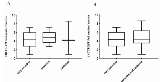 DDP activity data were available for 25 high-grade serous/endometrioid OC-PDX models (Table S2)—ten were very sensitive, 12 were sensitive and 3 were resistant to DDP. The ERCC1 IHC-score was not statistically related to sensitivity to DDP (Kruskal–Wallis p = 0.847, Figure S3). In addition, no differences were detected between the mean ERCC1/XPF foci numbers per nucleus and response to therapy, when considering the three response groups, very sensitive, sensitive and resistant (Kruskal–Wallis p = 0.909, Figure 1A) and the two response groups, very sensitive vs. sensitive/resistant (Kruskal–Wallis p = 0.71, Figure 1B).