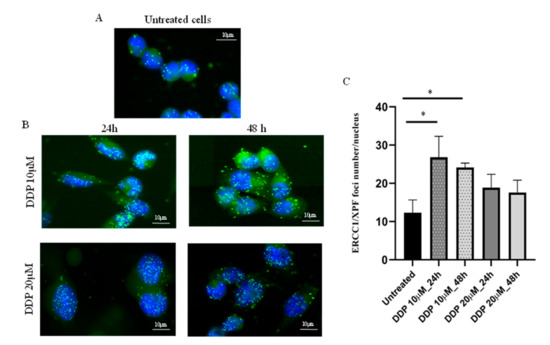 Detection and quantification of ERCC1/XPF foci numbers per nucleus (PLA) in A2780 ovarian cancer cells, untreated and after DDP. Nuclei of A2780 cells are shown in blue (DAPI) and ERCC1/XPF foci in the nuclei as green dots (FITC); magnification 40×, fluorescent microscopy. (A): ERCC1/XPF complexes expressed in untreated cells; (B): ERCC1/XPF foci in A2780 cells 24 h and 48 h after 10 μM (IC50) and 20 µM DDP-treatment; (C): quantification of ERCC1/XPF foci number per nucleus in A2780 untreated and DDP-treated cells with 10 µM (IC50) and 20 µM, fixed at two different time points. Each value is the mean ± standard deviation of three replicates and at least 50 nuclei were analyzed for each sample in different fields. Unpaired t-test was used to compare untreated vs. treated cells; * p ≤ 0.05.