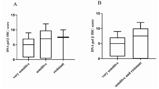 No difference between DDP sensitivity and the DNA pol β IHC-score (Kruskal–Wallis p = 0.664 and p = 0.366, respectively) was observed (Figure 3). Results were similar for DNA pol β mRNA expression level and the three categories of response (Kruskal–Wallis p = 0.204; Figure S4A), as already reported [15] and the two categories of response (Kruskal–Wallis p = 0.131; Figure S4B).