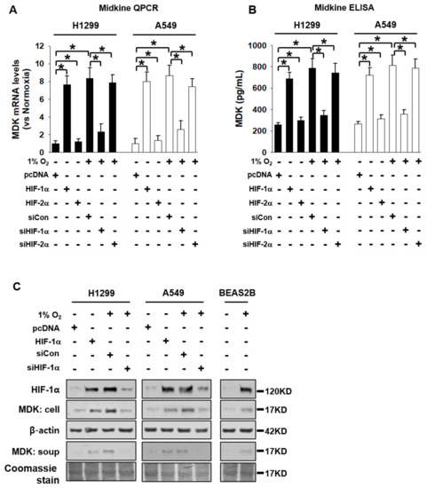 The tumor microenvironment differs from that of the normal tissue environment [1,2]. The critical difference between the tumor microenvironment and that of the surrounding normal tissue is the presence of intratumoral hypoxia [3]. In cancers such as cervical cancer, soft tissue sarcoma, and breast cancer, where tumor oxygenation is directly measured, hypoxic conditions (pO2 < 10 mmHg) prevail in the affected cells when compared with normal tissues (pO2 > 65 mmHg) [4,5,6]. Reduced O2 availability in hypoxia is a stimulus for the activation of hypoxia-inducible factor 1 (HIF-1), which is a heterodimeric protein composed of HIF-1α and HIF-1β. In addition, there are three HIF family members, HIF-1, HIF-2, and HIF-3 [7,8]. During hypoxia, proteasomal degradation of the complex containing HIF-1α and HIF-1β is inhibited, and the complex is transported to the nucleus, where it binds to HIF response elements (HREs, 5′-RCGTG-3′). The binding of the HIF complex to HREs triggers the recruitment of coactivator molecules that form transcription initiation complexes to enhance the expression of genes that mediate cellular and physiological responses to hypoxia [9]. Even though a number of genes are activated similarly by both HIF-1α and HIF-2α, glycolysis-related genes such as PGK1 and LDHA are up-regulated by HIF-1α, and some genes such as CITED2, PKIB and GADD45B are upregulated more than 2-fold by HIF-2α but not by HIF-1α [10]. In this study, we found that midkine (MDK) is up-regulated by hypoxia, more specifically, MDK mRNA, and the expression and secretion of the protein are regulated by HIF-1α in lung cancer cells.