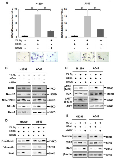 MDK promotes EMT in pancreatic cancer [26]. Therefore, we performed migration assays with H1299 and A549 cells after transfection with siCon and siMDK under hypoxic conditions. Even though H1299 is a mesenchymal type and A549 is an epithelial type cell confirmed by short tandem repeat profiling, basal levels of E-cadherin were different between these cell lines (Figure 4 and Figure S15). H1299 and A549 cells under hypoxic conditions significantly migrated to the bottom chamber in transwell membranes compared with the control group, which was attenuated by siMDK (Figure 4A). These results suggest that the EMT character or cell migration of mesenchymal and epithelial type lung cancer cell lines is affected by hypoxia-induced MDK. To identify all the molecular alterations that MDK promoted during the migration of NSCLC cells, we analyzed by western blotting under the same condition as shown in Figure 4A. MDK expressed under hypoxia decreased Notch2 levels and induced Notch2 intracellular domain (NICD) cleavage, which is the active form of Notch2. The MDK-mediated increase in the Notch2 ICD level could increase NF-κB protein expression, which is known to be the central regulator of EMT and anti-apoptotic signaling, and as expected we found elevated NF-κB protein levels. To further validate MDK-mediated Notch2 cleavage and activation, we analyzed the protein expression of the well-known Notch target in mammals, Hes-1, and found elevated protein levels in NSCLC cells under hypoxic conditions. Furthermore, not only did we find substantially decreased E-cadherin and elevated Vimentin and Snail levels, but we also noticed elevated levels of Survivin and XIAP anti-apoptotic factors, increased phosphorylation of PI3K and AKT, and decreased levels of a pro-apoptotic factor, BAD, in hypoxia-exposed cells. However, under the same condition of H1299 and A549 cells, MDK knock down by siMDK upregulated the Notch 2 “level” that was not “signaling”. Actually, siMDK “downregulated” or “suppressed” Notch2 signaling. It was also noted that in MDK-induced NF-κB, Hes-1 survival signals, anti-apoptotic factors, and EMT markers were decreased. E-cadherin and BAD proteins were elevated in an inverse manner (Figure 4B–E). However, overexpressed survivin could not increase E-cadherin again, which was decreased by siMDK under hypoxic conditions (Figure S11). Hao et al. also reported iMDK, an MDK inhibitor, suppressed PI3K and induced the apoptotic pathway in H441 lung adenocarcinoma cells [21]. These results suggest that MDK increased by hypoxia induced the cleavage of Notch2 ICD, which in turn activated NF-κB and Hes-1. The MDK-Notch2-NF-κB-Hes-1 signal axis increased the expression of mesenchymal markers, and lung cancer cells became more disorganized and moveable. However, MDK knock down even under hypoxic conditions down regulated the Notch2-NF-κB-Hes-1 signal axis.