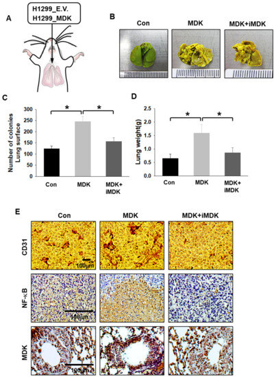 To confirm the in vivo benefit of inhibiting MDK in an MDK-expressed lung tumor model, we constructed a xenograft in vivo model with H1299 cells, which stably expressed the empty vector (E.V.) and MDK genes because all tumor tissue could be exposed by hypoxia and we needed to check the MDK effects of the -pro-tumor, EMT, and angiogenesis via gain-of-function study (Figure 5A and Figure S6). MDK has been identified as a positive regulator of angiogenesis and is secreted by cancers to stimulate normal endothelial cell growth through paracrine signaling [27,28,29,30]. As mentioned before, the tumor volume of the stably overexpressed MDK group began to grow bigger than that of the control group treated with DMSO from around 40 days. Moreover, we applied the MDK inhibitor iMDK to determine the possibility of a therapeutic target. Hao et al. reported that iMDK suppressed endogenous MDK expression in lung adenocarcinoma cells and reduced tumor volume derived from H441 lung adenocarcinoma cells in a xenograft mouse model. iMDK (9 mg/kg) was intraperitoneally applied to one group for three days per week and the other group for five days per week, and the dosage ws determined after analysis of mice weight, serum AST, and ALT from mice treated with iMDK (9 mg/kg) [21]. In order to determine whether systemic administration of iMDK suppresses tumor growth, iMDK (9 mg/kg) was intraperitoneally injected once every two days into nude mice after a tumor volume around 100 mm3 was reached. Tumor volume and tumor weight in cells expressing MDK were almost twice as high as the control group. However, iMDK showed an anti-tumor effect which significantly decreased tumor volume and tumor weight compared to the control group (Figure 5–C). To substantiate the results with anti-tumor and anti-angiogenic effects, tissue staining assays were performed with H&E, anti-T antigen, Ki-67, and CD-31. Histological analysis showed a more proliferative, aggressive, and invasive phenotype in the MDK-expression group which had inter-mingled with the surrounding acinar tissue and more neo-vasculazation compared to the control group, whereas the majority of iMDK-treated tumors under the same condition were predominantly encapsulated or micro-invasive and the numbers of CD-31 stained cells were lower than in the control group. This aggravated invasive phenotype was readily revealed by immunohistochemical staining for the SV40T antigen oncoprotein, which is a marker of cancer cells (Figure 5C). In addition, we confirmed whether in vitro signaling occurred in vivo samples. Immunoblotting samples from the in vivo xenograft model showed that MDK-expression samples showed increased XIAP and vimentin and decreased E-cadherin cleaved caspase-3, which were reversed by iMDK treatment (Figure S12). To further determine the consequences of the invasiveness effect, we next investigated the possible occurrences of distant metastasis, mainly focusing on the lung. We first constructed an in vivo xenograft model, similar to Figure 5A, and then solid tumors in the mice flank were surgically removed. After 60 days, micro invasiveness of H1299 under MDK expression showed high metastasis in the lung compared with the control group. However, the iMDK treatment group had no significant metastasis compared with the MDK group. The presence of tumor metastasis in the lung was determined by lung images and corroborated by H&E staining (Figure 5D). Quantification of the incidence of macroscopic lung metastasis in each group revealed that the incidence of lung metastasis was 9-fold higher in the MDK-expression group than in the control group or iMDK-treated group. These results suggest that pro-tumor, EMT, and angiogenesis of lung cancer are dependent on MDK expression.
