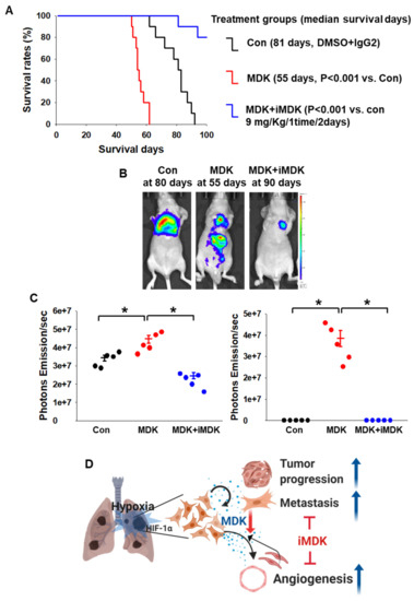 Increased life span and tumor reduction in iMDK-treated lung tumorigenesis. (A) Kaplan–Meier survival curves in lung orthotopic tumor-bearing mice treated continuously with control, MDK, and MDK+iMDK starting at 30 days after treatment. DMSO treated mice showed a median survival days of 81 days; mice receiving continuous MDK+iMDK treatment demonstrated a survival benefit but not in the MDK-expression group. Kaplan–Meier statistic, n = 5, * p < 0.001. (B) Representative bio-luminescence images at 80 days for the control, at 55 days for MDK, and at 90 days for iMDK are shown, revealing a BLI signal originating from the site of injection. (C) The photon emission values in Figure 7B represent the mean ±SEM of the indicated number of mice. * p < 0.05 based on Student’s t-test. (D) Schematic diagram summarizing hypoxia-induced MDK NSCLC cell tumor progression and metastasis and its inhibition.