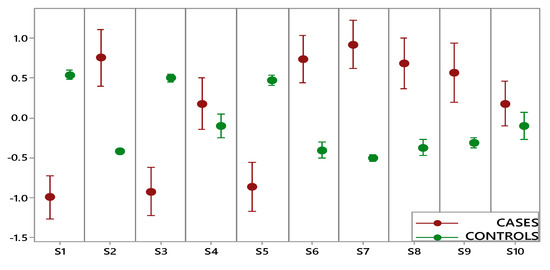 Figure 1 shows the sensor signals collected during the sampling phase on a case (a) and a control (b) sample. The x-axis represents the sampling time, while the sensor responses are reported on the y-axis. As displayed in Figure 1, the sensor responses gradually increased during sampling, reaching a plateau after 15–20 s. From the histograms representing the responses collected after 40 s of sampling, it is possible to notice that the sensor signals were lower for the control sample, while for the OC case, three sensors (S2, S6, and S7) showed significantly increased signals. To select the MOS sensors relevant for OC cases detection, an interval plot was primarily built on the e-nose dataset transformed by column autoscaling to eliminate the numerical differences between variables. The interval plot shows the 95% confidence interval for the mean value of each group. The difference among groups is statistically relevant only if there is no overlap of the indicator bars, and the width of the intervals correlates with the amount of variation in the data.