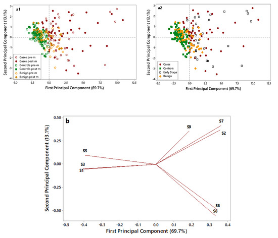 A further Principal Component Analysis (PCA) elaboration was applied to data collected by the eight selected metal oxide semiconductor (MOS) sensors, to identify the most informative sensors useful in discriminating OC cases from non-cancer samples (i.e., controls and benign disease). Figure 3 displays the PCA score plots (a1 and a2) and loading plots (b) of the data collected on OC cases (red), benign disease (yellow), and controls’ (green) samples.