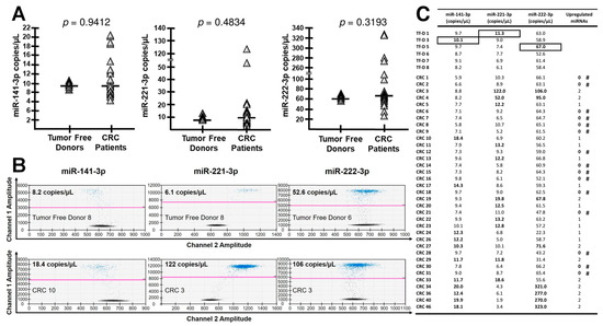 Digital Droplet RT-PCR (dd-RT-PCR) of miR-141, miR-221 and miR-222 in CRC patients. (A): Plasma samples from 35 CRC patients (CRC) and 6 tumor-free donors (Tf-D) were assessed by dd-RT-PCR. Representative plots are depicted in panel (B) and a summary in panel (C). (C): the highest values in Tf-D control samples are black boxed, and denote up-regulation in the CRC samples compared to the highest control. The number of up-regulated miRNAs in CRC patients (indicated in bold) is noted. # = no miRNA up-regulation.