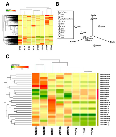 miRNome analysis. (A): Hierarchical clustering of the miRNAs identified in each expression of library pattern. The miRNAs were from tumor-free donors (Tf-D) and colorectal cancer (CRC) patients’ blood samples. Green = down-regulation; red = up-regulation. (B): Profile of overall miRNAs expression changes. The differential expression levels of miRNA in library (CRC) versus healthy groups. Each shape in the 3D visualization represents a group of miRNAs. Principal component analysis (PCA) captured the variation observed in the experiment in the first three principal components (PC). (C): The heatmaps of CRC samples versus tumor-free plasmas are shown in Figure S1 (FC > 1.5) and in Figure 2C (FC > 2).