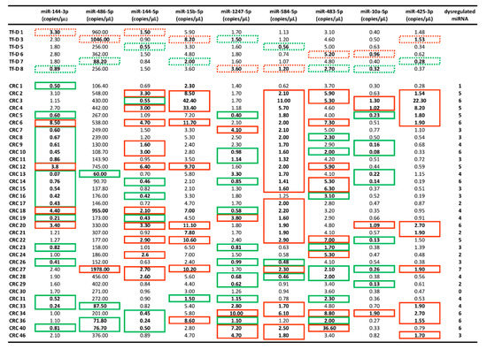 miRNA content in plasma samples. Plasma miRNAs levels (copies/µL) in Tumor-free Donors (from Tf-D1 to Tf-D8) and CRC (from CRC1 to CRC46) plasma samples. Values detected by dd-RT-PCR. The dotted green and red boxes in the control samples indicate the plasma lowest (green) and highest (red) miRNA levels used for comparison with the CRC samples. In the CRC samples, the solid green boxes show down-regulated miRNA values (lower values with respect to the lowest values found in controls), while the solid red boxes show up-regulated miRNA values (higher values with respect to the highest values found in controls). The number of dysregulated miRNAs is indicated from each CRC sample in the last right columns (this numbers in several CRC samples increase considering the analysis of miR-141-3p, miR-221-3p and miR-222-3p shown in Figure 1C). A further analysis comparing CRC values with the average values found in controls is reported in Figure S2. A comparison of miR-15b-5p, miR-584-5p and miR-425-3p (displaying an upregulation trend in CRC samples), and miR-141-3p, miR-221-3p and miR-222-3p, is shown in Table S3.