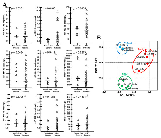 Digital droplet RT-PCR validation and principal component analysis (PCA). (A): Digital droplet RT-PCR validation (dd-RT-PCR) comparing plasma samples from 35 CRC patients and 6 tumor-free donors with respect to the content of dysregulated miRNAs. (B): PCA captured the variation observed in the experiment in the first three principal components (PC). Three principal microRNA sets on the basis of their respective correlations can be proposed, as depicted in the panel. The nine miRNAs of the proposed signature, plus the miR-141-3p, miR-221-3p and miR-222-3p, were considered.