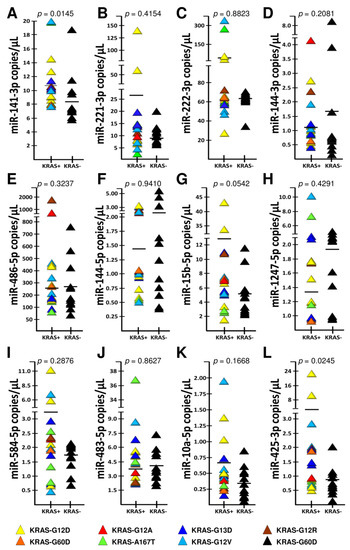 Correlation between miRNA dysregulation and KRAS mutations. (A–L): dd-RT-PCR comparison of plasma samples from KRAS-MUT vs. KRAS-WT CRC patients (see Figure 4) with respect to content of dys-regulated miRNAs, including miR-141-3p (A), miR-221-3p (B) and miR-222-3p (C).
