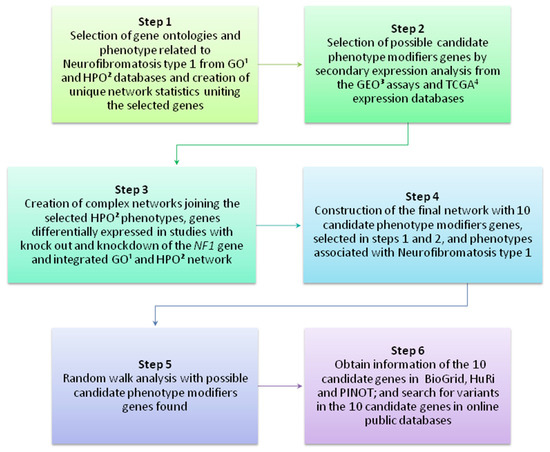 One obvious limitation of the present study is the lack of proper validation for the candidate phenotype-modifier genes using benchwork. Hence, the results obtained must be evaluated with caution. Experimental validation is necessary and strongly recommended before clinical extrapolation. However, our purpose was to provide a new look in the strategies for evaluation of neurofibromatosis using the huge amount of data already available in shared public-curated datasets. For example, the protein–protein interactions identified by us were previously validated by several in vitro assays and here combined in a network. Together with our network analysis, we also performed random walk, a robust mathematical model that has been applied in the analysis of biological multiplex heterogeneous networks [76,77]. We hope this complex and robust systems biology approach will help to better understand the neurofibromatosis type 1 and its phenotypic variation.