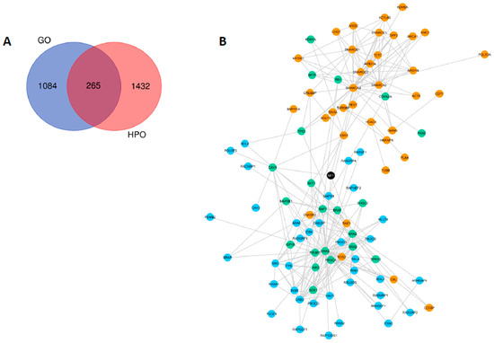 NF1 Gene Ontology (GO) and NF1 Human Phenotype Ontology (HPO) results. (A) Venn diagram showing in red genes related with neurofibromatosis type 1 exclusively found by the HPO project in the selected ontologies for NF1; genes exclusively found by the GO consortium using the ontologies selected for NF1 are shown in blue; and in purple genes shared by both GO and HPO analysis. (B) A combined network using the STRING tool using the 1697 genes selected exclusively in HPO (orange nodes); 1449 genes selected exclusively in GO (blue nodes); and 265 genes observed in both HPO and GO (green nodes). The network shows only direct protein–protein interactions with NF1 (first neighbors).