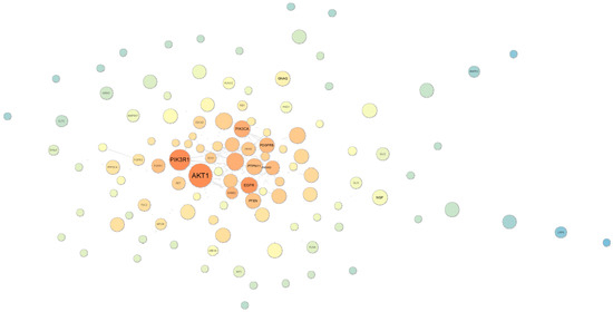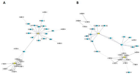 To verify the nodes with relevant roles in the information flow from the network assembled in the previous section (Figure 2), systems biology network statistics were applied using Cytoscape v.3.7.2 software. Two main parameters were observed: (I) betweenness centrality, a measure based on the communication paths, meaning the nodes with high betweenness centrality could be important in the control of the information flow; and (II) the closeness centrality measure, which is based on the fastness of this information flow (from the central node to the others) [31]. The resulting network had 1561 nodes, making it difficult to visualize the main nodes. A simplified version, representing only the first neighbors, can be assessed in Figure 3.