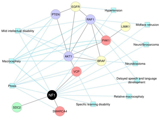 According to this mathematical model, the NF1 gene only had to take “one step” (one interaction) to reach the phenotype OMIM 162200. The genes SDC2 and VCP had to take only two steps (two interactions) (Figure 5), whilst the other eight candidates needed more interactions to cause the syndrome (Figure S8). Genes LIMK1 and PAK1 also needed a higher number of potential interactions, and hence more steps, than the others.