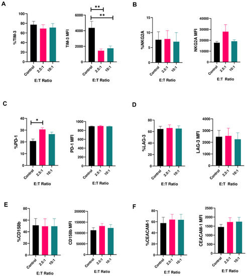 Expression of inhibitory receptors on human NK cells in response to cancer cells (mean ± SEM). Percentage (left panels) and median fluorescence intensity (MFI) (right panels) of (A) T-cell immunoglobulin and mucin-containing domain (TIM-3); (B) NGK2A; (C) PD-1; (D) LAG-3; (E) CD158b; (F) CEACAM-1 on peripheral blood-derived human NK cells upon co-culture with U87MG cells for 4 h at effector:target (E:T) ratios of 2.5:1 and 10:1 (n = 6–9 samples). * p < 0.05, ** p < 0.01.