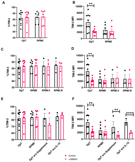 Expression of TIM-3 on NK cells in response to cancer cells under varying stimulation conditions of cytokine and supplement compositions (mean ± SEM). Percentage and MFI of TIM-3 were measured on human NK cells after 4 h co-culture with GBM43 cells at an E:T ratio of 2.5:1. (A,B) TIM-3 expression on NK cells expanded in complete NK-modified OpTmizer™ (OpT) (n = 10 donors) or RPMI-based expansion medium (RPMIf, n = 7); (C,D) TIM-3 expression on NK cells expanded in OpT, RPMIf, RPMI medium modified to contain 10 ng/mL rhIL-15 and 25 ng/mL rhIL-21 (RPMI II, n = 3) or RPMI medium modified to contain 10 ng/mL rhIL-15 (RPMI III, n = 3); (E,F) TIM-3 expression on NK cells expanded in OpTmizer™ (OpT), RPMIf, OpT medium without supplement (OpT w/o supplement, n = 3), or OpT without IL-15 (OpT w/o IL-15, n = 3). ** p < 0.01, **** p < 0.0001.