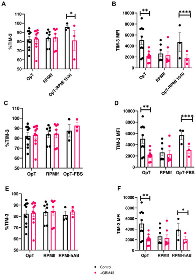 We next investigated the role of human serum, which had been added, as human AB serum, at a concentration of 5% to each OpTmizer™ recipe. To do so, we first prepared a variant of OpTmizer™ medium by replacing human AB serum with FBS (OpT-FBS) at the same concentration (5%). Exposure of human NK cells activated in FBS-containing OpTmizer™ (OpT-FBS) to GBM cells led to a small (7.92%) increase in TIM-3+ NK cells (Figure 4C), but a decrease in TIM-3 MFI expression following basal upregulation as observed before (Figure 4D).