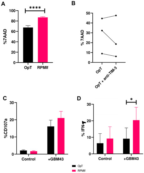 Functional potential of human NK cells against GBM43 cells under varying stimulation conditions (mean ± SEM). Cytotoxicity of human NK cells after 4 h co-culture with GBM43 cells at an E:T ratio of 2.5:1 following stimulation in either (A) OpT or RPMIf medium (n = 3 donors); and (B) following TIM-3 blockade stratified for three individual donors (n = 3); (C) CD107a and (D) IFN-γ production (n = 3) by NK cells stimulated in OpT or RPMIf in response to GBM43 cells. * p < 0.05 and **** p < 0.0001.