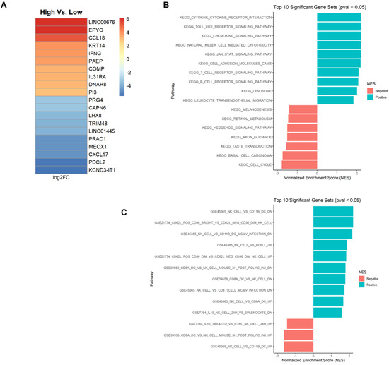 Glioblastoma (GBM) RNA-seq data were downloaded from TCGA [26] and patients (n = 156) were classified into high/low groups based on expression of HAVCR2, based on upper and lower quartiles, which are 50% for each high and low. Ultimately, this classification identified 78 samples with high HAVCR2 expression and 78 samples with low HAVCR2 expression. Next, differential expression (DE) analysis was performed using edgeR [27,28] between high vs. low groups to identify statistically significant differentially expressed genes. False discovery rate was controlled using the Benjamini–Hochberg method [29] at α = 0.05. Next, a gene set enrichment analysis (GSEA) [30] was performed with the KEGG, Go-Biological Processes (GO.BP) and Immunologic collections from MSigDB. GSEA was performed using the FGSEA tool and genes were ranked by log2FC values. Additionally, a custom NK gene set was used in performing a GSEA, comprised of five genes (NCR1, NCR3, KLRB1, CD160, PRF1) [31] that have been known to have high expression in NK cells.