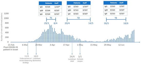 Serum samples were analyzed at three time points for the detection of anti-COVID19 antibodies. For IgG expression, we used anti-SARS-CoV-2 IgG assay (Abbott, Abbott Park, IL, USA), a chemiluminescent microparticle qualitative immunoassay (CMIA) detected in ARCHITECT i system with a cutoff result of 1.4 (positive result > 1.4). The anti-SARS-CoV-2 IgG assay gained Food and Drug Administration (FDA) Emergency Use Authorization (EUA). IgM expression was detected using an EDI Novel Coronavirus COVID19 IgM ELISA qualitative detection assay (Epitope Diagnostics Inc., San Diego, CA, USA), and IgA expression was detected using anti-SARS-CoV-2 ELISA (IgA) semi-quantitative assay (EUROIMMUN AG, Luebeck, Germany). All serological tests were conducted at Rambam virology diagnostic unit.
