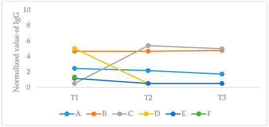 COVID19-positive serology values. Normalized values of SARS-CoV-2 IgG at the three examined time points. Positive expression was considered above the threshold value of 1.4. Participant F had only the T1 sample.