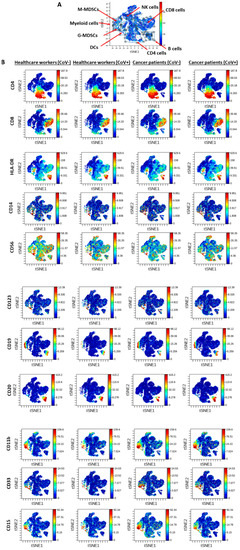 Immune composition of healthcare workers and cancer patients who are COVID19-positive or -negative. Peripheral blood samples from healthcare workers negative to SARS-CoV-2 IgG (CoV−, n = 6) or positive to SARS-CoV-2 IgG (n = 2) as well as cancer patients who were SARS-CoV-2 IgG-negative and -positive (n = 2 for each group, matched individuals) were acquired by mass cytometry (CyTOF). The samples were then grouped as indicated in the figure, and the percentages of various immune cells were analyzed as shown in Table 3. (A) A representative viSNE plot of the different immune cell population detected. (B) The specific surface markers representing the different immune cells, as indicated in Table S4, are shown for the four groups. DCs: dendritic cells, M-MDSCs: monocytic myeloid derived suppressor cells, G-MDSCs: granulocytic myeloid derived suppressor cells. In the viSNE plot, red represents high expression whereas blue represents low or no expression.