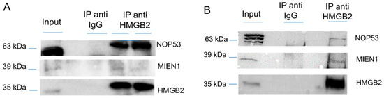 Co-immunoprecipitation of HMGB2 and MIEN1 or NOP53 (A) in SKOV-3 cells (B) in PEO1 cells. Proteins extracted from cells (Input) were immunoprecipitated with HMGB2 antibodies (IP anti HMMGB2) or IgG (IP anti IgG) and the Western blot were incubated with HMGB2, MIEN1 and NOP53 antibodies.