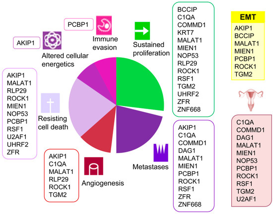Associations of proteins detected in the Y2H EOC-HMGB-interactome to cancer hallmarks, EOC and EMT. Proteins previously related to cancer from ovarian origin are shown under the ovary pictogram; those involved in epithelial to mesenchymal transition under the yellow EMT box. References supporting the scheme are indicated for each protein as follows. AKIP1 [56,57,58,59,60], BCCIP [61,62], COMMD1 [63,64,65], C1QA [66], DAG1 [67], KRT7 [68], MALAT1 [24,69,70], MIEN1 [55,71,72], NOP53 [73,74,75], PCBP1 [76,77,78], RLP29 [79,80], ROCK1 [38,81,82,83,84,85,86], RSF1 [47,48,87,88], TGM2 [89,90], UHRF2 [91,92], U2AF1 [93], ZNF668 [94,95], ZRF [96,97,98].