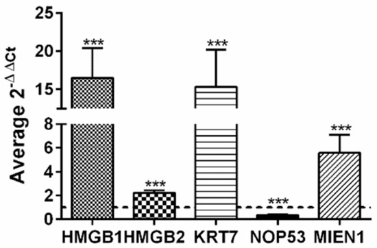 Relative expression of HMGB1, HMGB2, KRT7, MIEN1 and NOP53 genes in SKOV-3 cells versus non-cancerous human ovarian HOSEpiC cells. The dotted line indicates no variation, boxes upper the line show genes over-expressed in SKOV-3 cells, and those under the line are genes under-expressed in SKOV-3 cells. *** (p < 0.001).